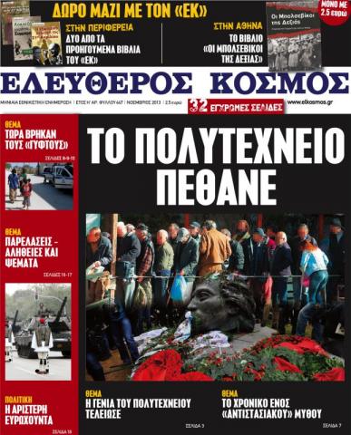 Το νέο τεύχος της εφημερίδας «Ελεύθερος Κόσμος» για τον μήνα Νοέμβριο ασχολείται με το παραμύθι της Μεταπολίτευσης, του Πολυτεχνείου και το αποδομεί. Μία ιστορική αναφορά στα όσα συνέβησαν τον Νοέμβριο του 1973 αλλά και κυρίως στις αλήθειες που επιμελώς κρύφτηκαν. Επίσης, γίνεται μία πολιτική κριτική της περιβόητης «γενιάς του Πολυτεχνείου» και στο πώς με τα έργα της απαξιώθηκε στα μάτια των γενεών που έρχονται.