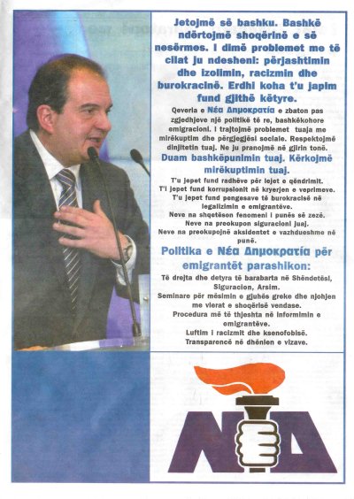 Ζούμε μαζί. Μαζί φτιάχνουμε την κοινωνία του αύριο. Ξέρουμε τα προβλήματα που συναντάτε: Περιθωριοποίηση, απομόνωση, ρατσισμός και γραφειοκρατία. Ήρθε ο καιρός να δώσουμε ένα τέλος σε όλα αυτά. Η κυβέρνηση της Νέας Δημοκρατίας μετά τις εκλογές θα εφαρμόσει μία νέα και σύγχρονη μεταναστευτική πολιτική. Η αντιμετώπιση των προβλημάτων σας θα γίνει καλοπροαίρετα και με κοινωνική υπευθυνότητα. Σεβόμαστε την αξιοπρέπειά σας. Εμείς σας αποδεχόμαστε στην κοινωνία μας. Θέλουμε τη συνεργασία σας και την κατανόησή σας. Ας δώσουμε τέλος στις ουρές για τις άδειες παραμονής. Ας δώσουμε τέλος στην διαφθορά και τους χρηματισμούς κατά την κατάθεση των εγγράφων. Ας δώσουμε τέλος στα εμπόδια της γραφειοκρατίας για την νομιμοποίηση των μεταναστών. Μας ενοχλεί το φαινόμενο της μαύρης εργασίας. Μας ενδιαφέρει να είστε ασφαλισμένοι. Μας νοιάζουν τα ατυχήματα που σας συμβαίνουν διαρκώς στη δουλειά.