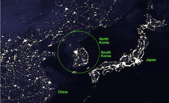 Η φωτογραφία που συνοδεύει την ανάρτηση είναι από δορυφόρο και δείχνει ιδιαίτερα πειστικά την «επιτυχία» σοσιαλισμού στην κορεάτικη χερσόνησο. Στα ανατολικά η πολύ φωτεινή Ιαπωνία, στα δυτικά η όλο και φωτεινότερη Κίνα, στα νότια της χερσονήσου η εξίσου φωτεινή Νότια Κορέα και μετά το σχεδόν απόλυτο σκοτάδι της Βόρειας Κορέας.