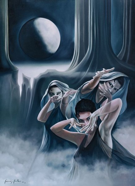 Εδώ θα πρέπει να πούμε ότι ενώ οι ήρωες του πολλές φορές είναι θύματα της ειμαρμένης, την αντιμετωπίζουν δυναμικά. Από την άλλη οι γυναίκες του κύκλου των Αγγέλων είναι μοιραίες, ερωτικές και απειλητικές. Mία άποψη που μοιράζεται με τους σουρρεαλιστές με τους οποίους έχει πολλά κοινά στοιχεία, όπως ο ονειρικός συνειρμός και το ονειρικό στοιχείο ενός Νταλί (της εποχής όμως του «Ονείρου του Χριστόφορου Κολόμβου» και του «Μυστικού Δείπνου» και όχι των «Λιωμένων Ρολογιών». Ενώ σε πίνακες, όπως «Η αμαρτία των ευσεβών» υπάρχει ο χλευασμός προς την βλακεία που υπήρχε στον Μπρύγκελ.