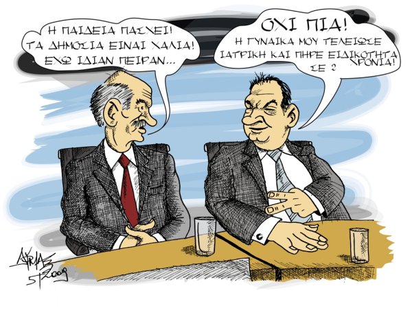 * Τώρα που είπα «χέρι χέρι» κάνω μία παρένθεση, ενθυμούμενος τον ισχυρισμό του κ. Παπανδρέου στο ντιμπέιτ, ότι φοίτησε εν Ελλάδι σε δημόσια σχολεία. Έμαθα, λοιπόν, ότι το '61, τότε που τον φώναζαν ακόμη Τζέφρεϊ - ελληνιστί Γοδεφρείδο, η Βασίλισσα Φρειδερίκη τον πήρε «χέρι-χέρι» μαζί με τον αδελφό του, και τους ενέγραψε στο Κολλέγιο. Με διαταγή της μάλιστα δημιουργήθηκε ειδικό τμήμα για τους δύο, επειδή δεν μιλούσαν γρι ελληνικά.