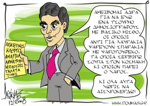 * Θερμά συγχαρητήρια στον Νίκο Ευαγγελάτο για την καταπληκτική του εκπομπή, αυτήν της περασμένης Τετάρτης, όπου ασχολήθηκε με τους εμπόρους και την «αισχροκέρδεια» τους. Οι έμποροι, λέει, αγοράζουν ένα μπλουζάκι από την Κίνα στα δύο ευρώ και το πουλούν δώδεκα. Αισχροκέρδεια, αισχροκέρδεια. Έτσι είναι. Το γεγονός ότι κάποιος σηκώθηκε μια μέρα, τρέχοντας στου διαόλου τη μάνα για να κλείσει συμφωνίες με κινεζικά εργοστάσια, τα οποία του επέβαλλαν ελάχιστη παραγγελία δεκαπλάσια από τις ανάγκες του δεν συμπεριλαμβάνεται στο κόστος. Ούτε, βέβαια τα λειτουργικά του έξοδα που διπλασιάστηκαν μέσα σε μία διετία. Ούτε και το τεράστιο στοκ που καλείται να ξεπουλήσει σε διάστημα μερικών μηνών. Ούτε η ρευστότητα που θυσίασε, επειδή οι κινέζοι πληρώνονται μπροστά. Ούτε, ασφαλώς και ο αέρας και το τεράστιο ενοίκιο περιλαμβάνεται στο κόστος ούτε και το προσωπικό.