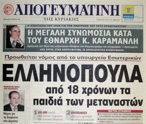 Καλοκαιρινές εκπλήξεις φαίνεται ότι μας ετοιμάζει ο υπουργός Εσωτερικών κ. Προκόπης Παυλόπουλος. Σύμφωνα με πρωτοσέλιδο δημοσίευμα της «Απογευματινής της Κυριακής» (1) ο κ. Παυλόπουλος «αντιμετωπίζει με τον πλέον θετικό τρόπο» την πρόταση της Κεντρικής Επιτροπής Απλούστευσης Διαδικασιών για πολιτογράφηση των παιδιών των μεταναστών.