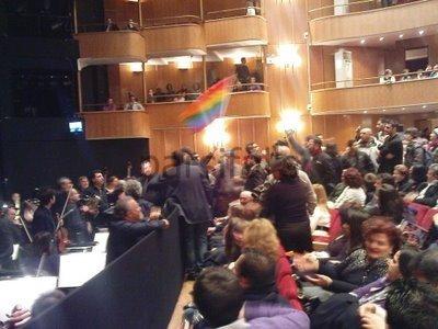 Σαν να μην έφτανε αυτό, ξεσηκώθηκαν οι ομοφυλοφιλικές Μη Κυβερνητικές Οργανώσεις με πρωτεργάτη τον φιλοσκοπιανό Γρηγόρη Βαλλιανάτο, και μάλιστα από την ίδια την Βάσερμαν που θεώρησε ότι η δουλειά της λογοκρίνεται. Έτσι θέλησαν να καταλάβουν την αίθουσα και να διαβάσουν με το ζόρι στους θεατές την άποψη τους για την «ομοφοβική» ανακοίνωση της Ορχήστρας της ΕΛΣ. Εκεί όμως βρήκαν την αντίσταση τόσο των ανθρώπων της ασφάλειας του κτιρίου, αλλά και των ίδιων των μουσικών που είχαν προφανώς σαλτάρει από τις καταλήψεις των προηγούμενων εβδομάδων από τους τραμπούκους των Εξαρχείων.