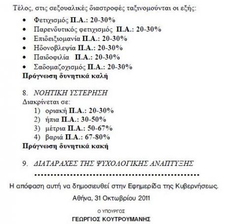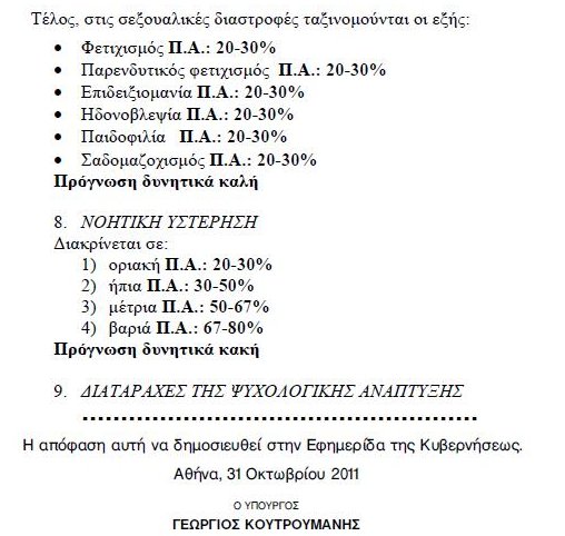 Με την φασαρία που έγινε με την υπ. αριθ. 2611 ΦΕΚ της 8ης Νοεμβρίου 2011 όπου «είχαν περιληφθεί μεταξύ των ψυχικώς πασχόντων, κατηγορίες ατόμων όπως παιδόφιλοι, επιδειξιομανείς, εθισμένοι στον τζόγο, κλεπτομανείς και πυρομανείς» χάθηκε η ουσία της υπόθεσης που είναι πολύ πιο σημαντική από την συγκεκριμένη είδηση. Ο θόρυβος για τους σχετικά «ανάπηρους» παιδόφιλους που αν συντρέχουν και άλλοι λόγοι μπορούν να απολαμβάνουν «μειωμένα τιμολόγια στους λογαριασμούς της ΔΕΗ, ή σε εισιτήρια Μέσων Μαζικής Μεταφοράς» παρουσιάστηκε ως ένα άλλο ευτράπελο γεγονός του ανοργάνωτου ελληνικού κράτους. Δυστυχώς η πραγματικότητα είναι πολύ χειρότερη.