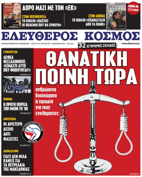 Στο νέο φύλλο της μηνιαίας έκδοσής του, που κυκλοφορεί την Παρασκευή 11 Ιανουαρίου, ο «Ελεύθερος Κόσμος» ανοίγει το θέμα της επαναφοράς της θανατικής ποινής, ως απάντηση στα ειδεχθή εγκλήματα που συγκλονίζουν τον τελευταίο καιρό την ελληνική κοινωνία.