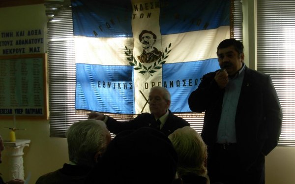 Πρώτος πήρε τον λόγο ο πρόεδρος της «Χ», Γιάννης Γιαννάκενας, ο οποίος απηύθυνε χαιρετισμό στους παρευρισκομένους, αναφέρθηκε στους ηρωικούς αγώνες των Χιτών και στο σημερινό καθήκον ημών των νεωτέρων να φανούμε αντάξιοί τους, στην σημερινή δύσκολη για την πατρίδα μας πραγματικότητα. Χρέος όλων μας είναι να σταθούμε όρθιοι τις κρίσιμες αυτές στιγμές, να δώσουμε στον αγώνα μας από το υστέρημά μας, μη υπάρχοντος περισσεύματος, πλέον. Αυτό κάνει πιο συνειδητή και πιο επιτακτική την αλληλεγγύη και την αλληλοϋποστήριξη στο δικό μας χώρο. Σε κρίσιμες στιγμές, όπως σήμερα, δεν μπορεί να κοιτάμε αυτά που μας χωρίζουνε, αλλά αυτά που μας ενώνουνε, για τον ένα και μέγα σκοπό που είναι πάντα η Πατρίδα. Η αίθουσα «Γεώργιος Γρίβας - Διγενής» είναι ένας χώρος που φιλοδοξεί να συμβάλλει σε αυτήν την ενότητα, μία έπαλξη ανασυγκρότησης σκέψεως και ιστορικής αλήθειας, γιʼ αυτό έχει προγραμματιστεί εκεί μία σειρά διαλέξεων ιστορικού και πατριωτικού περιεχομένου.