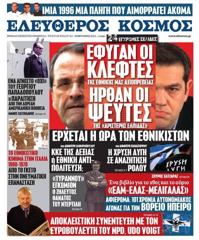 Πολλά και ενδιαφέροντα θέματα βρείτε στο φύλλο του «Ελεύθερου Κόσμου» που θα κυκλοφορήσει το Σάββατο στα περίπτερα όλης της χώρας. Θα διαβάσετε στις την ανάλυση, των Δημήτρη Ζαφειρόπουλου και Δημήτρη Παπαγεωργίου για τον ρόλο που καλείται να διαδραματίσει η Χρυσή Αυγή στην νέα πολιτική πραγματικότητα που διαμορφώνεται στην χώρα.