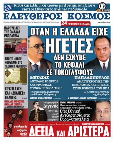 Κυκλοφoρεί το νέο φύλλο του «Ελεύθερου Κόσμου» στα περίπτερα όλης της Ελλάδος με κεντρικό θέμα: «Ιωάννης Μεταξάς - Γεώργιος Παπαδόπουλος: Όταν η Ελλάδα είχε ηγέτες δεν έσκυβε το κεφάλι σε τοκογλύφους». Στις 24 έγχρωμες σελίδες μπορείτε να διαβάσετε: