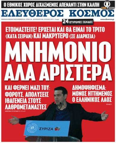 «Πρώτη φορά μνημόνιο αλά αριστερά» αυτό έδειξε η πολυαναμενόμενη και πολύωρη σύσκεψη των πολιτικών αρχηγών, τι μας περιμένει. 48 ώρες μετά τα αποτελέσματα αναζητείται ηγέτης να ενώσει την πατρίδα. Ο εμφύλιος ανάμεσα στους κουλτουριάρηδες και η ανίερη σύγκριση Μεταξά-Τσίπρα. Και ακόμα: Ο Ευθύμιος Πέτρου γράφει για τον ελληνικό λαό που είναι ο μόνος χαμένος, «Οι εθνοπατέρες και τα ψευτοδιλήμματα του συστήματος» από τον Γιώργο Δημητρούλια και «Επιτακτική ανάγκη να γίνει δημοψήφισμα για την ιθαγένεια» από τον Νίκο Τζιόπα. Για το ίδιο θέμα γράφουν: Ο Σπύρος Χατζάρας για τους τοκογλύφους των Βρυξελών και ο Γιάννης Κουριαννίδης για την επόμενη μέρα του ΝΑΙ και του ΟΧΙ. «Ντροπή ποιο είναι το χρώμα σου» οι λόγοι ενός μοναχικού αλλά τίμιου δρόμου.