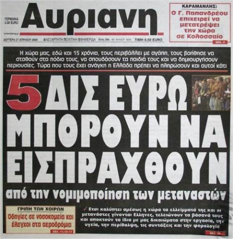 Μία απερίσκεπτη πρόταση διατύπωσε μέσα από την εφημερίδα του ο γνωστός τηλεοπτικός παρουσιαστής, δημοσιογράφος και εκδότης Νίκος Χατζηνικολάου. Η πρότασή του ήταν η εξής: «Με αυστηρούς όρους και προϋποθέσεις να νομιμοποιηθεί η παραμονή εκατοντάδων χιλιάδων μεταναστών που ζουν παράνομα στην Ελλάδα. Με διαδικασίες-εξπρές και έναντι ενός ποσού, όσοι κατοικούν και εργάζονται για χρόνια στη χώρα να ενταχθούν ομαλά στην ελληνική κοινωνία» (Real News, 26/4/2009). Αξιοσημείωτο είναι το γεγονός ότι αντίστοιχη πρόταση έκανε με πρωτοσέλιδό της και η εφημερίδα «Αυριανή» της επόμενης ημέρας (27/4/2009). Νέες νομιμοποιήσεις παρανόμων μεταναστών προανήγγειλε και ο πρόεδρος του ΠΑΣΟΚ Γιώργος Παπανδρέου, ο οποίος σε συνέντευξή του υπογράμμισε ότι το ΠΑΣΟΚ ως κυβέρνηση σκοπεύει «να εντάξει τους νόμιμους μετανάστες και όσους αποφασίσει ότι χρήζουν νομιμοποίησης στην κοινωνία μας» (Πρώτο Θέμα, 26/4/2009). Ακόμα και ο βοηθός Συνήγορος του Πολίτη για τα Δικαιώματα του Ανθρώπου Ανδρέας Τάκης σε συνέντευξή του επισήμανε ότι «είναι αδήριτη ανάγκη ο σκοτεινός πληθυσμός των αλλοδαπών χωρίς χαρτιά να ανασυρθεί στην επιφάνεια της κοινωνικής ζωής με μια ήπιας μορφής αναγνώριση, όχι κατ' ανάγκη άδεια παραμονής, που θα τους επιτρέψει να έχουν νόμιμη συναλλαγή με την ελληνική διοίκηση για τα χρειώδη» (Καθημερινή, 2/5/2009).
