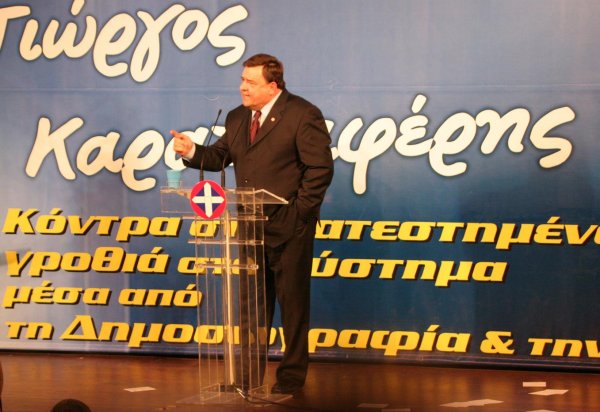 Στην συνέχεια, μέσα σε πανηγυρικό κλίμα και υπό τους ήχους της «Μυθωδίας», με τους χιλιάδες παρευρισκομένους να φωνάζουν συνθήματα υπέρ του ΛΑ.Ο.Σ. ανέβηκε στο βήμα ο Γιώργος Καρατζαφέρης. Ο Πρόεδρος του ΛΑ.Ο.Σ. ζήτησε να γίνουν οι εκλογές όσο το δυνατόν γρηγορότερα, αφού η Eλλάδα δεν αντέχει μια κυβέρνηση αλαζονική και αναιμική. «Θα φέρουμε εις πέρας την αποστολή μας και θα μπούμε στην Βουλή με περισσότερους από 15 βουλευτές. Εμείς θα επιβάλλουμε τους όρους του παιχνιδιού. Αυτό το ξέρει ο Καραμανλής και γι' αυτό χρηματοδοτεί τον Παπαθεμελή να κάνει κόμμα, γι' αυτό πληρώνει με χρήματα του Δημοσίου τις εταιρείες δημοσκοπήσεων προκειμένου να βγάζουν λανθασμένα ποσοστά, αλλά και βάζει τους Ποντίους να γυρίσουν εναντίον μας, αλλά ότι και να κάνει το ποτάμι δεν γυρίζει πίσω. Σε λίγους μήνες θα κάνουμε το όραμα πράξη» δήλωσε χαρακτηριστικά στο τέλος της πανηγυρικής του ομιλίας.