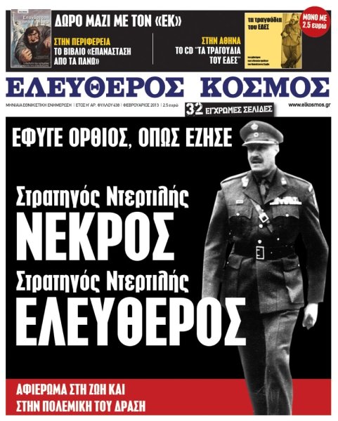 Την Παρασκευή 1η Φεβρουαρίου μην χάσετε το νέο φύλλο του μηνιαίου «Ελεύθερου Κόσμου» με αφιέρωμα στον εκλιπόντα, τελευταίο έγκλειστο της επταετίας. Άγνωστες πτυχές από την στρατιωτική του δράση και τις σχέσεις του με τους υπόλοιπους παράγοντες της 21ης Απριλίου. Γράφουν οι Δ. Παπαγεωργίου, Μ. Χατζηδάκης, Τ. Αλτζερίνος. Η τελευταία του συνέντευξη στον Δ. Ζαφειρόπουλο.