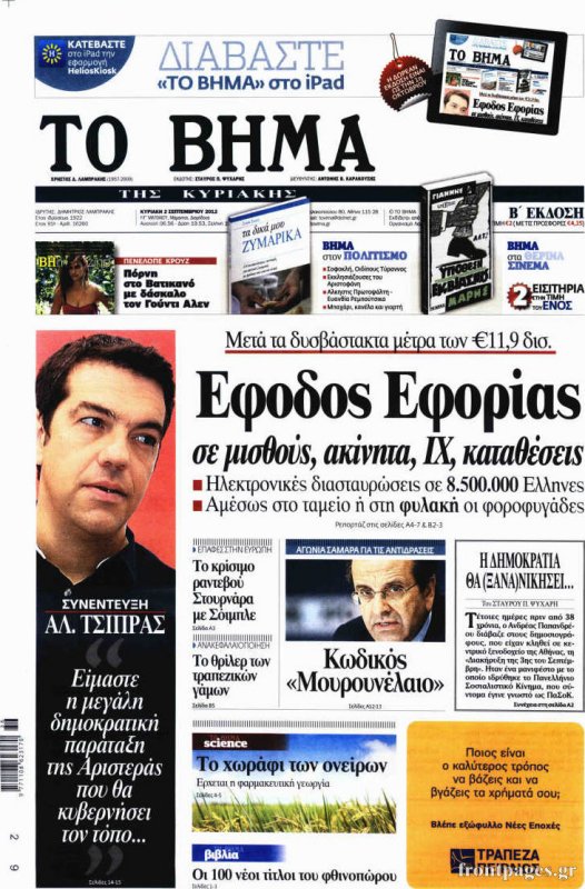 «Ή πληρώνεις ή πας φυλακή» ήταν ο τίτλος του Βήματος. Στο ρεπορτάζ διαβάζουμε: «Το ζήτημα αυτό ανακίνησε πρώτος ο ίδιος ο κ. Αντ. Σαμαράς διαπιστώνοντας πως, παρ' ότι οι διωκτικές αρχές έχουν εντοπίσει τους τελευταίους μήνες έναν μεγάλο αριθμό φοροφυγάδων, το όφελος για την Ελληνική Οικονομία είναι σχεδόν μηδαμινό».