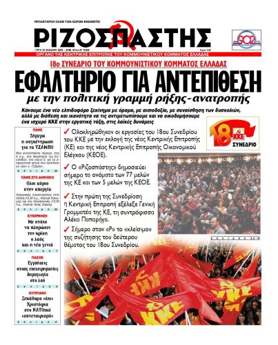 Οι σκέψεις αυτές μού ήρθαν στο μυαλό προχθές, βλέποντας το πρωτοσέλιδο του «Ριζοσπάστη», που, μετά το 18ο συνέδριο του ΚΚΕ, μιλούσε για υλοποίηση μιας πολιτικής γραμμής «ρήξης - ανατροπής»! Η υιοθέτηση του βασικού πολιτικού συνθήματος του Λαϊκού Ορθόδοξου Συναγερμού από το ΚΚΕ, ενός συνθήματος πάνω στο οποίο κτίστηκε και ανδρώθηκε ο ΛΑ.Ο.Σ., λέει πολλά.