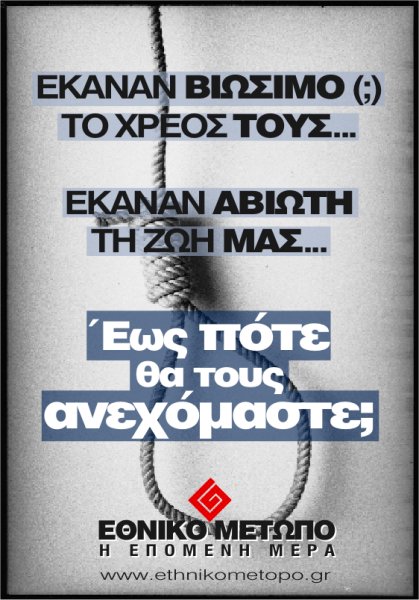 Κρέμασε τα μέτρα όχι την ζωή σου. Η ουσιαστική συνειδητοποίηση του φαινομένου της κρίσης σε όλες τις διαστάσεις του και η τραγική μοίρα τόσων Ελλήνων - χιλιάδες αυτοκτονίες, χιλιάδες οικογενειακά δράματα, εκατοντάδες χιλιάδες μετανάστες - επιβάλλει την αντίδραση. Οφείλει ο Έλληνας σήμερα να αντιδράσει. Να αρνηθεί την αιτιολόγηση της κρίσης από τους απολογητές του δανεισμού και της εξάρτησης. Η ζωή των Ελλήνων είναι πολύτιμη, το έθνος δεν θα υπάρξει χωρίς αυτούς, καμία άλλη οντότητα και σχέση, διακρατική ή άλλη δεν έχει περισσότερη σημασία. Δεν υπάρχουν περιθώρια για περαιτέρω υποβάθμιση της υγείας, της εκπαίδευσης, της άμυνας, της διαβίωσης των πολιτών.