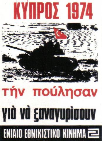 Το σύνθημα αυτό που στις αρχές της δεκαετίας του '80 κοσμούσε μία αφίσα του Ενιαίου Εθνικιστικού Κινήματος εκφράζει με τον καλύτερο τρόπο τα γεγονότα του Ιουλίου του 1974. Προδόθηκε και αιματοκυλίσθηκε η Κύπρος, για να μπορέσει η τάξη των πολιτικών να επιστρέψει στην χώρα μετά την "επάρατη" παρένθεση της 21ης Απριλίου.