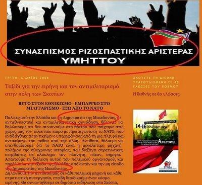 Η ανακοίνωση που υπάρχει στην ιστοσελίδα του "Δικτύου", και μπορεί να την βρει κανένας μέσω της επίσημης ιστοσελίδας της Νεολαίας Συνασπισμού, είναι ξεκάθαρη. Αναφερόμενοι στην εκδήλωση που διοργανώθηκε στα Σκόπια στις 17 Μαΐου, εναντίον κάθε Εθνικισμού, δεν διστάζουν να αναφέρονται στην Π.Γ.Δ.Μ. σαν "Δημοκρατία της Μακεδονίας" και να αναγνωρίζουν την ύπαρξη "εθνικά Μακεδόνων". Εκεί στο τέλος της ανακοίνωσης προς γνώσιν και συμμόρφωση όλων, προς παραδειγματισμό, διασφάλιση της ξεχωριστής αντίληψης που έχουν και για να μην τύχει και κανείς τους ... κλέψει την δόξα, αναφέρουν και τους συμμετέχοντες στην εν λόγω εκδήλωση. Φαρδιά πλατιά εκεί λοιπόν, και η Νεολαία του Συνασπισμού.