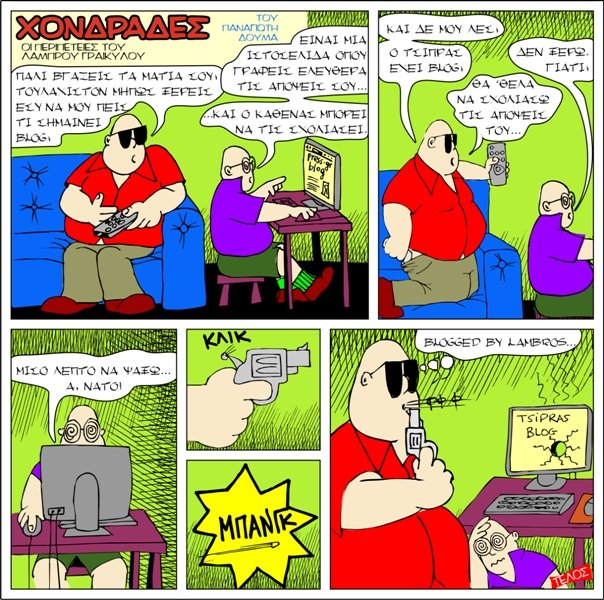 Ο Λάμπρος Γραικύλος κάνει δυναμικό «comeback» στο Patria Μαρτίου 2008. Ανειλημμένες υποχρεώσεις δεν μου επέτρεψαν να δημοσιεύσω κάποιο κόμικ στο προηγούμενο Patria και ελπίζω να σας αποζημιώσω με αυτήν την συνέχεια που θα μπορούσε να φέρει τίτλο «Blogged by Lambros».