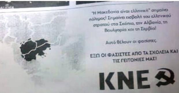 Το ζήσαμε και την προηγούμενη εβδομάδα, με αφορμή τις αυθόρμητες και συγκινητικές πρωτοβουλίες των μαθητών γυμνασίων και λυκείων σε ολόκληρη την ελληνική επικράτεια, σε Ελλάδα και Κύπρο. Χωρίς ντροπή, η ΚΝΕ κυκλοφόρησε σε όλη την Ελλάδα προκηρύξεις, στις οποίες αναφέρει, μεταξύ άλλων, ότι ««Η Μακεδονία είναι ελληνική» σημαίνει πόλεμος! Σημαίνει εισβολή του ελληνικού στρατού στα Σκόπια, την Αλβανία, την Βουλγαρία και την Σερβία! Αυτό θέλουν οι φασίστες. Έξω οι φασίστες από τα σχολεία και τις γειτονιές μας», ενώ παράλληλα επιχειρείται ταύτιση των μαθητικών κινητοποιήσεων με χρυσαυγίτικους κύκλους, γράφοντας: «Οι δολοφόνοι του Φύσσα έχουν το θράσος να καλούν και σε πορείες μαθητών»!