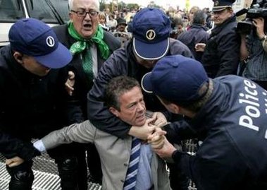11 Σεπτεμβρίου 2007. Μόλις επέστρεψα στο σπίτι μου από την διαδήλωση στις Βρυξέλλες κατά του εξισλαμισμού της Ευρώπης. Η βελγική αστυνομία έσπασε στο ξύλο τους ειρηνικούς διαδηλωτές με έναν τρόπο που ακόμα και η βελγική κρατική τηλεόραση αποκάλεσε «εξαιρετικά βίαιο». Παρακάτω είναι μερικές εικόνες από βίντεο. Ο γκριζομάλλης άνδρας, ο οποίος δέχεται πρώτος την επίθεση της αστυνομίας, είναι ο Λουκ Φαν Νιβενχούισεν, αντιπρόεδρος της Φλαμανδικής Βουλής. Λίγο μετά η αστυνομία κακομεταχειρίζεται τον Φρανκ Βανχέκε, ευρωβουλευτή και πρόεδρο του μεγαλύτερου φλαμανδικού κόμματος Vlaams Belang (Φλαμανδικό Συμφέρον). Του φορούν χειροπέδες και τον σπρώχνουν σε ένα λεωφορείο της αστυνομίας. Στην συνέχεια η αστυνομία «περιποιείται» τον Φίλιπ Ντεβίντερ, τον επικεφαλής των επικεφαλής των ευρωβουλευτών του Vlaams Belang. Το χέρι του πιάνεται στις πόρτες του λεωφορείου που κλείνουν. Ένας Ιταλός και ένας Γάλλος ευρωβουλευτής συλλαμβάνονται επίσης. Οι διαδηλωτές κρατήθηκαν σε κελιά για 7 ώρες και αφέθηκαν ελεύθεροι αυτό το απόγευμα.