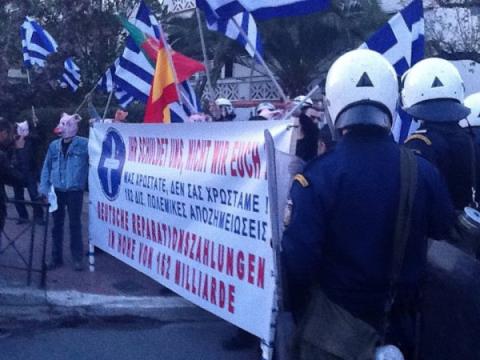 Μετά την Grande Place στις Βρυξέλλες, η ελληνική ομάδα «Youth of P.I.G.S.» πραγματοποίησε την Παρασκευή 30 Μαρτίου αιφνιδιαστική δράση στην γερμανική πρεσβεία στην Αθήνα. Τα μέλη του δικτύου κρατούσαν πανό που υπενθύμιζε απλά «Μας χρωστάτε, δεν σας χρωστάμε! 162 δις πολεμικές αποζημιώσεις». Δυστυχώς η ΕΛ.ΑΣ. έλαβε εντολή από την πολιτική της ηγεσία, μόλις ενημερώθηκε για το μήνυμα του πανό, να διαλύσει άμεσα την συγκέντρωση. Αυτό ήταν μόνο η αρχή σήμερα στην Αθήνα. Το δίκτυο έχει ετοιμάσει δράσεις σε πόλεις στην Ευρώπη, αλλά και μία μεγάλη έκπληξη μέσα στον Απρίλη στην Αθήνα.