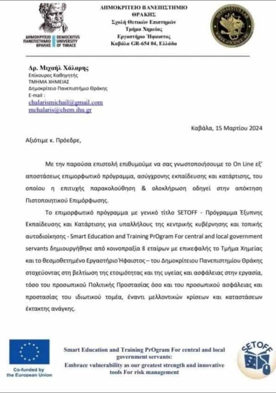 Οι πιο επικίνδυνοι είναι αυτοί που, στο πλαίσιο του «σεβασμού» της ντροπής των Πρεσπών, υιοθετούν και καταξιώνουν όρους όπως λ.χ. «μακεδονική γλώσσα». Πιο πρόσφατο λυπηρό και συνάμα εξοργιστικό παράδειγμα, η πρωτοβουλία του επίκουρου καθηγητή Χημείας στο Δημοκρίτειο Πανεπιστήμιο Θράκης, Μιχαήλ Χάλαρη, ο οποίος προσφάτως ανακοίνωσε την υλοποίηση επιμορφωτικού προγράμματος, μέσω του Εργαστηρίου «Ήφαιστος» του ΔΠΘ (με λήψη μάλιστα σχετικού πιστοποιητικού επιμόρφωσης»), απευθυνόμενο σε υπαλλήλους της κεντρικής κυβέρνησης και της τοπικής αυτοδιοίκησης, σχετικό με «την βελτίωση της ετοιμότητας και της υγείας και ασφάλειας στην εργασία». Το εν λόγω επιμορφωτικό πρόγραμμα, όπως αναφέρει σε σχετική επιστολή του ο κ. Χάλαρης, θα υλοποιηθεί σε πέντε διαφορετικές γλώσσες, μεταξύ των οποίων περιλαμβάνει και τα ... «μακεδονικά»!