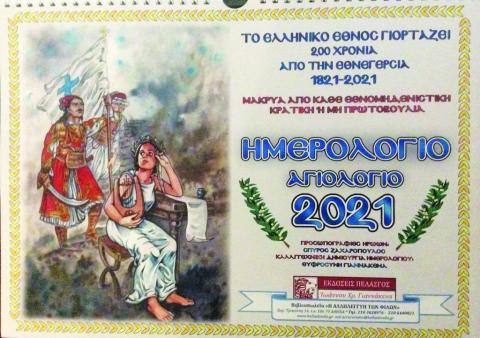 Ημερολόγιο – Αγιολόγιο 2021 από τις εκδόσεις Πελασγός. Αυτή η έκδοση ημερολογίου είναι αφιερωμένη στα 200χρονα από το ξέσπασμα της Εθνεγερσίας, του τιτάνιου Αγώνα των προπατόρων μας, που έσπασαν και για λογαριασμό μας τις αλυσίδες που μας είχαν περάσει οι Τούρκοι. Οι προσωπογραφίες των ηρώων έχουν γίνει από τον Σπύρο Ζαχαρόπουλο, την καλλιτεχνική δημιουργία του ημερολογίου υπογράφει η Ευφροσύνη Γιαννάκενα και την έκδοση επιμελήθηκε η Ελίνα Μαστέλλου-Γιαννάκενα.