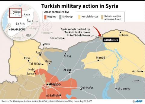 Η επίσκεψη του Αμερικανού αντιπροέδρου Μπάιντεν στην Άγκυρα συνέπεσε με την για πρώτη φορά ανάπτυξη μικρού μεγέθους τουρκικών στρατιωτικών δυνάμεων (επιπέδου ίλης αρμάτων, μηχανοκίνητου λόχου με ΤΟΜΠ και ΤΟΜΑ και ενός λόχου Ειδικών Δυνάμεων με την υποστήριξη UAV Bayraktar TB2) με την υποστήριξη πυροβολικού και ενός ζεύγους αεροσκαφών στο συριακό έδαφος, παρέχοντας κάλυψη σε δύναμη επιπέδου ταξιαρχίας αντικαθεστωτικών FSA (Free Syrian Army), οι οποίοι χθες το απόγευμα κατέλαβαν σύντομα και χωρίς ιδιαίτερη προσπάθεια την στρατηγικής σημασίας πόλη Τζαραμπουλούς (ή και Γιαραμπουλούς, Jarabulus).