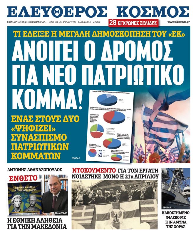 Το νέο φύλλο του «Ελεύθερου Κόσμου» κυκλοφορεί την Παρασκευή 4 Μαΐου σε όλη την Ελλάδα με δωρεάν πολυσέλιδο ένθετο του Αντώνη Αθανασόπουλου: «Η εθνική αλήθεια για την Μακεδονία». Διαβάστε σε αυτό το φύλλο: Νέο ξεκίνημα για το Πατριωτικό Κίνημα. Τα αποτελέσματα της μεγάλης δημοσκόπησης του «Ελεύθερου Κόσμου»: «Ένας στους δύο ψηφίζει συνασπισμό πατριωτικών κομμάτων».