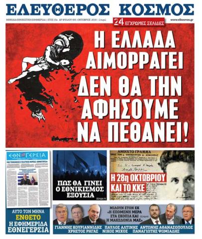 Το νέο φύλλο του «Ελεύθερου Κόσμου» κυκλοφορεί την Παρασκευή 5 Οκτωβρίου σε ολόκληρη την Ελλάδα με δωρεάν ένθετο, την εφημερίδα «Εθνεγερσία». Διαβάστε σε αυτό το φύλλο: «Η Ελλάδα αιμορραγεί δεν θα την αφήσουμε να πεθάνει!»