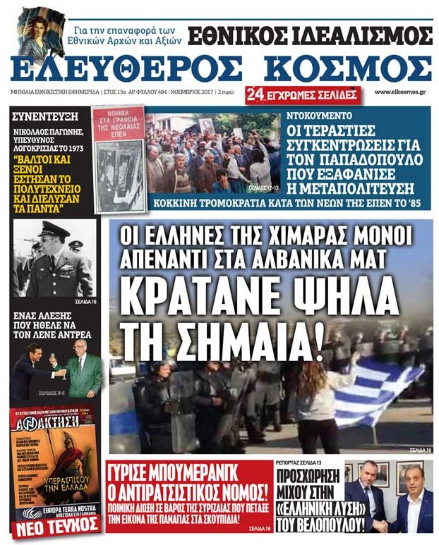 Οι Έλληνες της Χιμάρας μόνοι απέναντι στα αλβανικά ΜΑΤ κρατάνε ψηλά την Σημαία. Προσχώρηση Μίχου στην «Ελληνική Λύση» του Βελόπουλου. Όλο το ρεπορτάζ και η επιβεβαίωση του «Ελεύθερου Κόσμου». «Ένας Αλέξης που ήθελε να τον λένε Αντρέα» του Νίκου Παπαγεωργίου. Γύρισε μπούμερανγκ ο αντιρατσιστικός νόμος! Ποινική δίωξη σε βάρος της Συριζαίας που πέταξε την εικόνα της Παναγίας στα σκουπίδια.