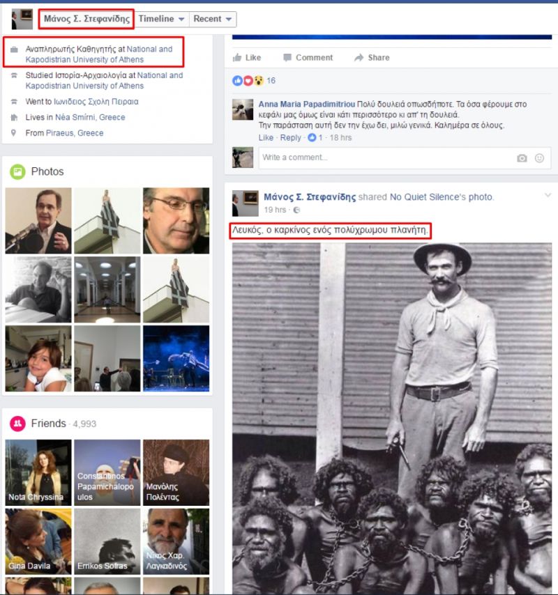 Και ως εκ τούτου καθόλου δεν παραξενευτήκαμε όταν χθες στο Διαδίκτυο είδαμε μια ανάρτησή του. Μία ανάρτηση στην οποία απεικονιζόταν κάποια σκηνή από κάποιον περασμένο αιώνα, όπου ένας λευκός άνδρας πόζαρε με κάποιους Αβορίγινες σκλάβους. Πιο πολύ ενδιαφέρον όμως είχε το δικό του σχόλιο που είχε μορφή «επικεφαλίδος» στην ανάρτηση και το οποίο ήταν το εξής: «Λευκός, ο καρκίνος ενός πολύχρωμου κόσμου».
