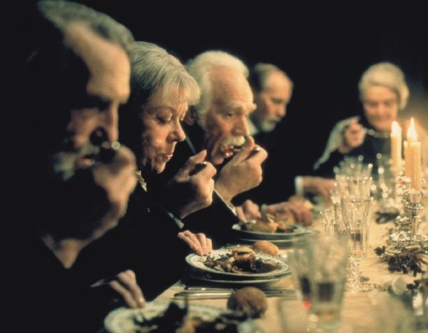 8. Η Γιορτή της Μπαμπέτ (1987) του Γκάμπριελ Άξελ. Πρωτότυπος Τίτλος: Babette’s Gaestebud. Η καλβινιστική κοινότητα που έχει ιδρύσει ένας χαρισματικός ιερέας και προφήτης σε μια παραλιακή κωμόπολη της Δανίας, μαστίζεται μετά τον θάνατο του από διχόνοιες. Όμως η Γαλλίδα πρόσφυγας Μπαμπέτ (Σάντρα Ωντέν) που δουλεύει για τις δύο μεσήλικες πλέον κόρες του πάστορα, (και είναι στην πραγματικότητα διάσημη σεφ) θα φτιάξει ένα λουκούλλειο γεύμα για όλη την κοινότητα, ξοδεύοντας κρυφά όλα τα λεφτά που κέρδισε σε ένα λαχείο. Αυτό το γεύμα ανιδιοτέλειας θα φέρει στο τέλος αισθήματα μεταμέλειας και συγχώρεσης στα μέλη της κοινότητας. Μια αλληγορία για την Θεία Κοινωνία που κέρδισε το Όσκαρ Ξενόφωνης Ταινίας.