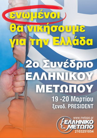 Το Σάββατο 19 Μαρτίου και την Κυριακή 20 Μαρτίου πραγματοποιήθηκε με απόλυτη επιτυχία το 2ο Συνέδριο του ΕΛΛΗΝΙΚΟΥ ΜΕΤΩΠΟΥ στην Αθήνα, στο ξενοδοχείο PRESIDENT, με κεντρικό μήνυμα «ΕΝΩΜΕΝΟΙ ΘΑ ΝΙΚΗΣΟΥΜΕ ΓΙΑ ΤΗΝ ΕΛΛΑΔΑ». Η συμμετοχή στο Συνέδριο ήταν μαζική (πάνω από 500 άτομα), οι εισηγήσεις ήταν πολύ υψηλού επιπέδου, η ομιλία του Μάκη Βορίδη για το μέλλον του Ελληνικού εθνικισμού εμπεριστατωμένη. Το σπουδαιότερο όμως γεγονός του Συνεδρίου ήταν η κοινή πολιτική πορεία που χαράχθηκε με τον Λαϊκό Ορθόδοξο Συναγερμό για ένα ισχυρό και αποτελεσματικό ΜΕΤΩΠΟ Εθνικής Αντιπολιτεύσεως.