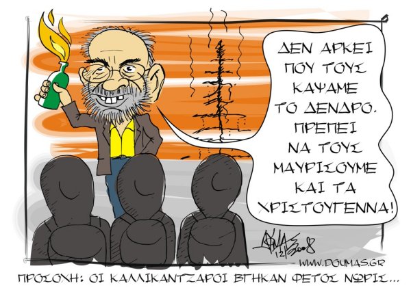 Όλοι αυτοί γυρνούν στα σπίτια τους τα βράδια, βήχοντας και με πονοκεφάλους για να δουν την τηλεπροπαγάνδα εκείνων που επιχαίρουν με την κατάσταση αυτή και προσπαθούν να την εξαργυρώσουν είτε με τα πεσμένα ποσοστά της κυβερνήσεως, είτε με τις βιασμένες συνειδήσεις μίας μεσαίας τάξεως, η οποία εξαθλιώνεται παραμιλώντας και προσπαθώντας μάταια να συμμαζέψει τα κομμάτια της, αγκιστρωμένη στις βαρύγδουπες εξαγγελίες της κυβερνήσεως ή και στην σπέκουλα της αξιωματικής αντιπολιτεύσεως.
